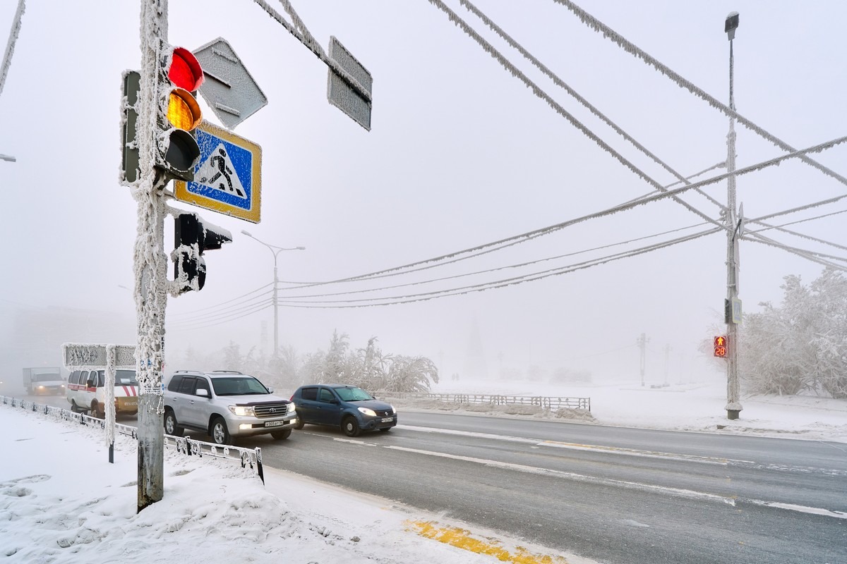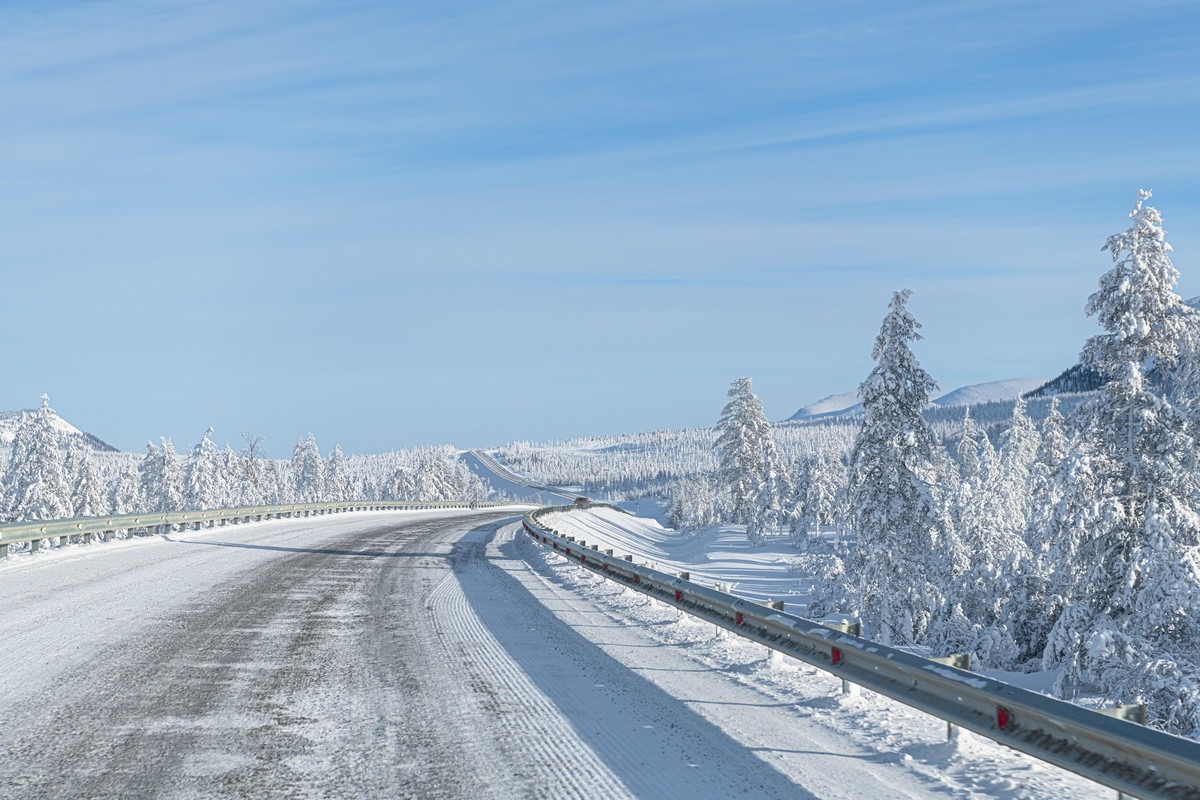When the temperature drops below -50°C, the world turns into something else. It doesn’t just freeze; it visually transforms. Everything gets wrapped up head to toe in hoarfrost and grows a thick layer of fluffy white crystals. It’s kind of like the inside of a freezer, only way more intense. Trees, road signs, poles and the wires on the poles are all coated in white hoarfrost: