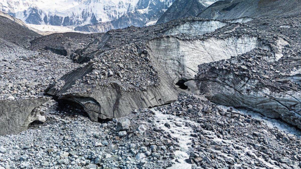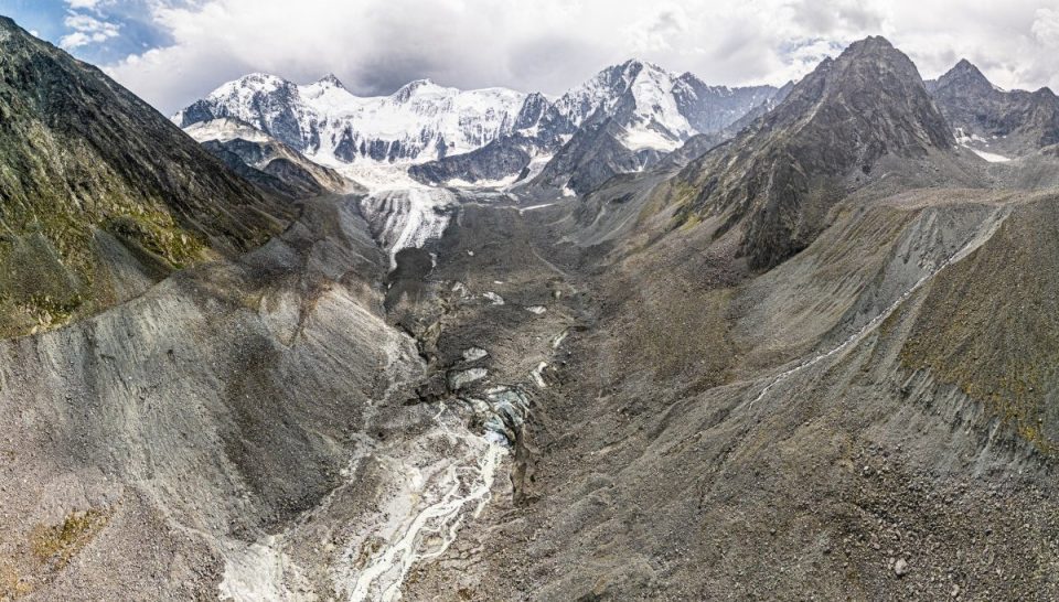 A drone’s-eye view from the glacier looking toward Akkem Lake: