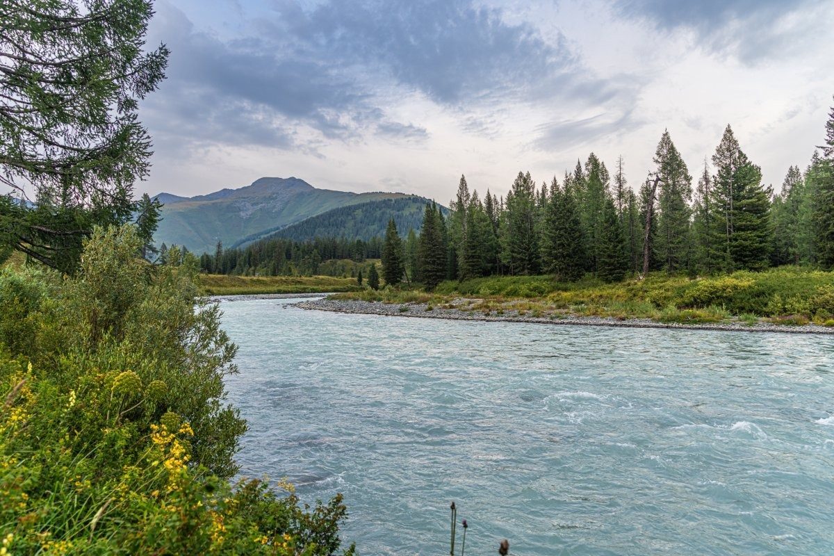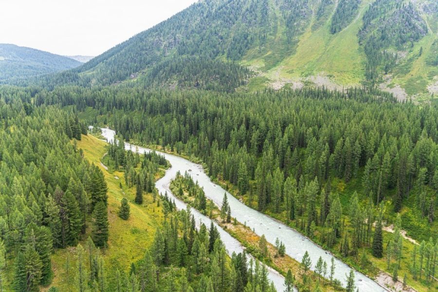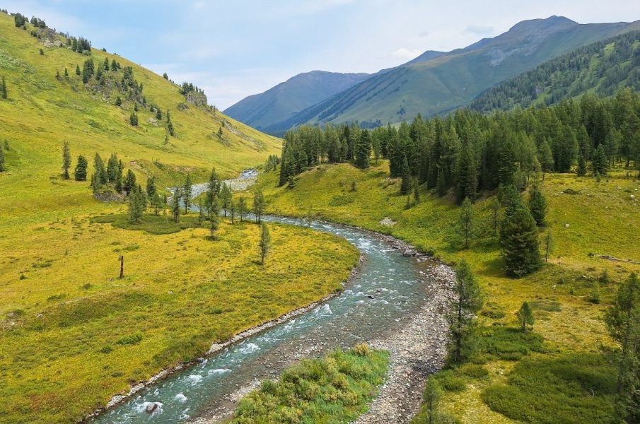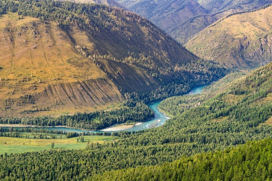 The Akkem River, lower left, heading toward its “big sister”, the Katun: