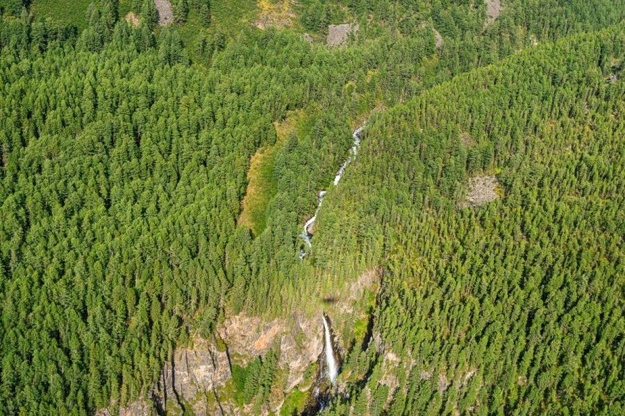 If you look closely, just left of center you can see a thin jagged line – that’s the trail we climbed on the other bank of the Tekelyu: