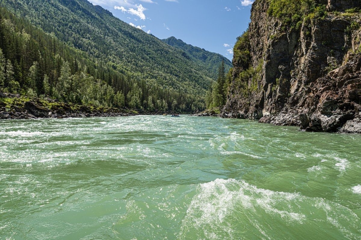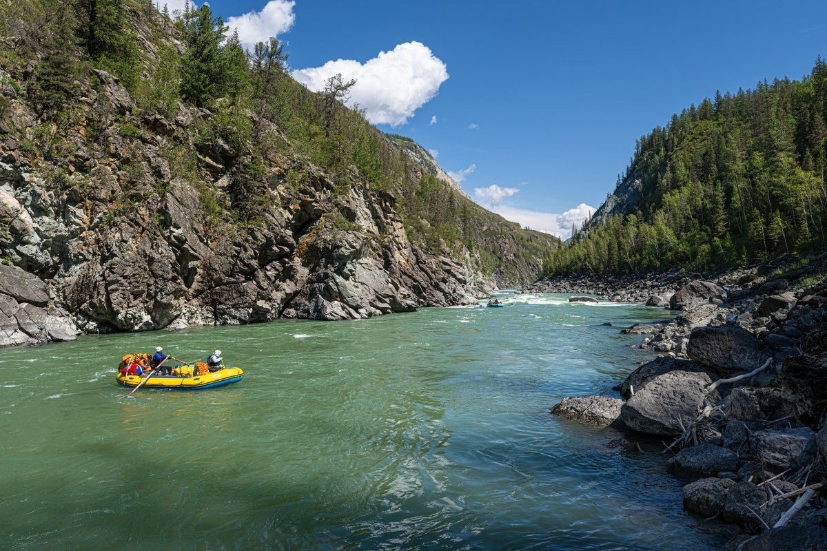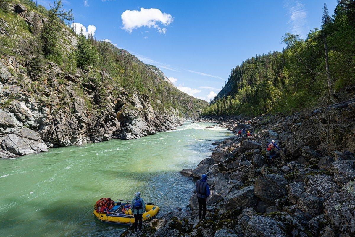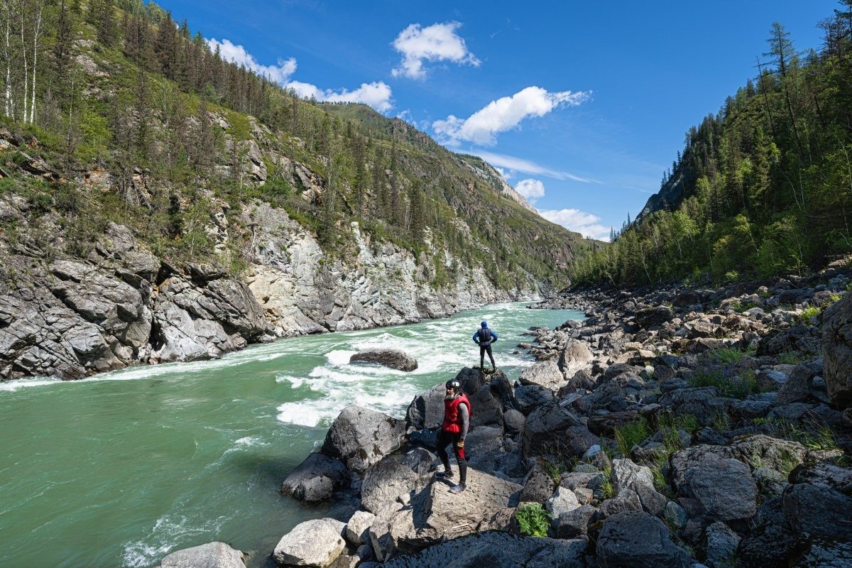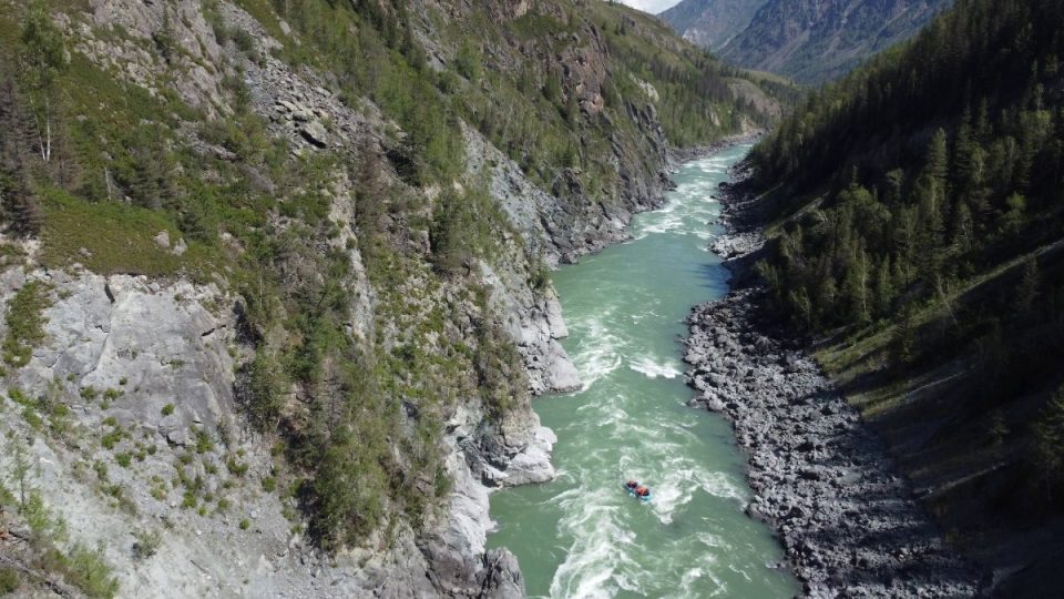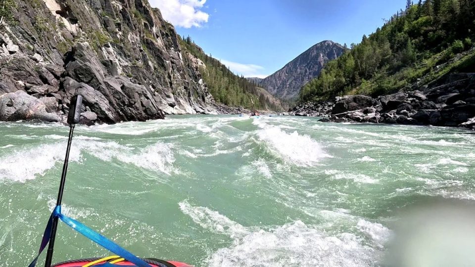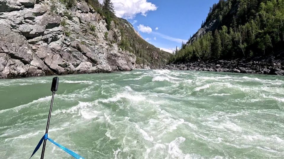 We finally made it to the main water “attraction” of the Katun: the Akkem Rush, aka the Akkem Breakthrough, aka the Pipe. Long ago, the Katun carved out a gorge about 12 kilometers long right here, squeezing the river down to just 30 meters wide. The result: all that water rushes forward with tremendous force…