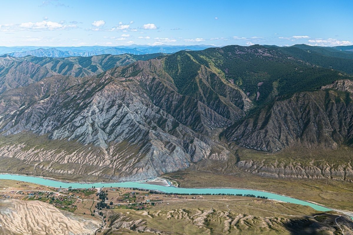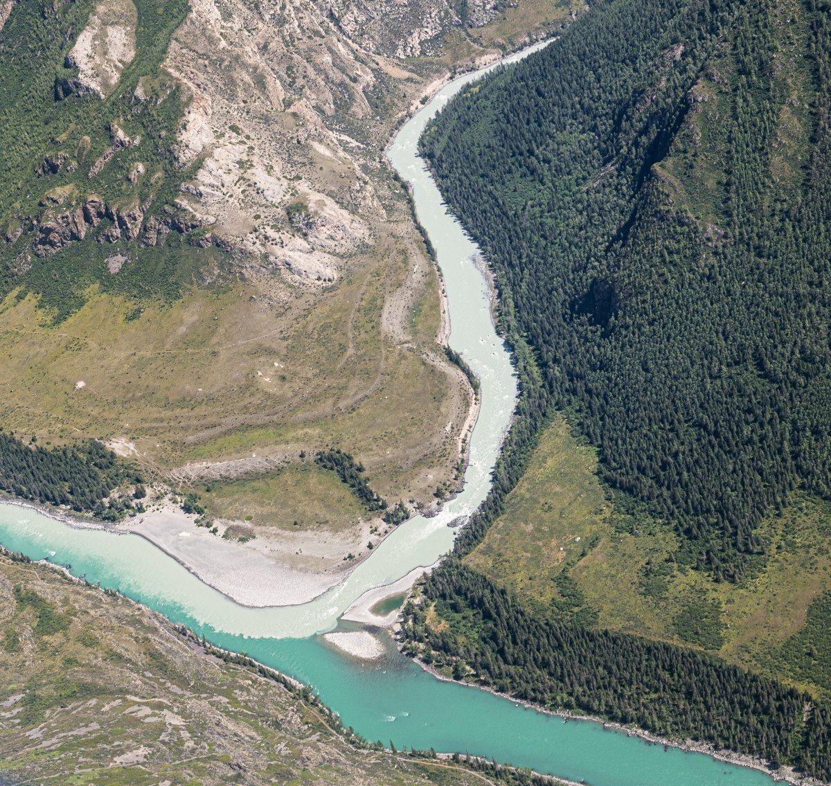 From the helicopter: the gray Argut river flows into the turquoise Katun ->