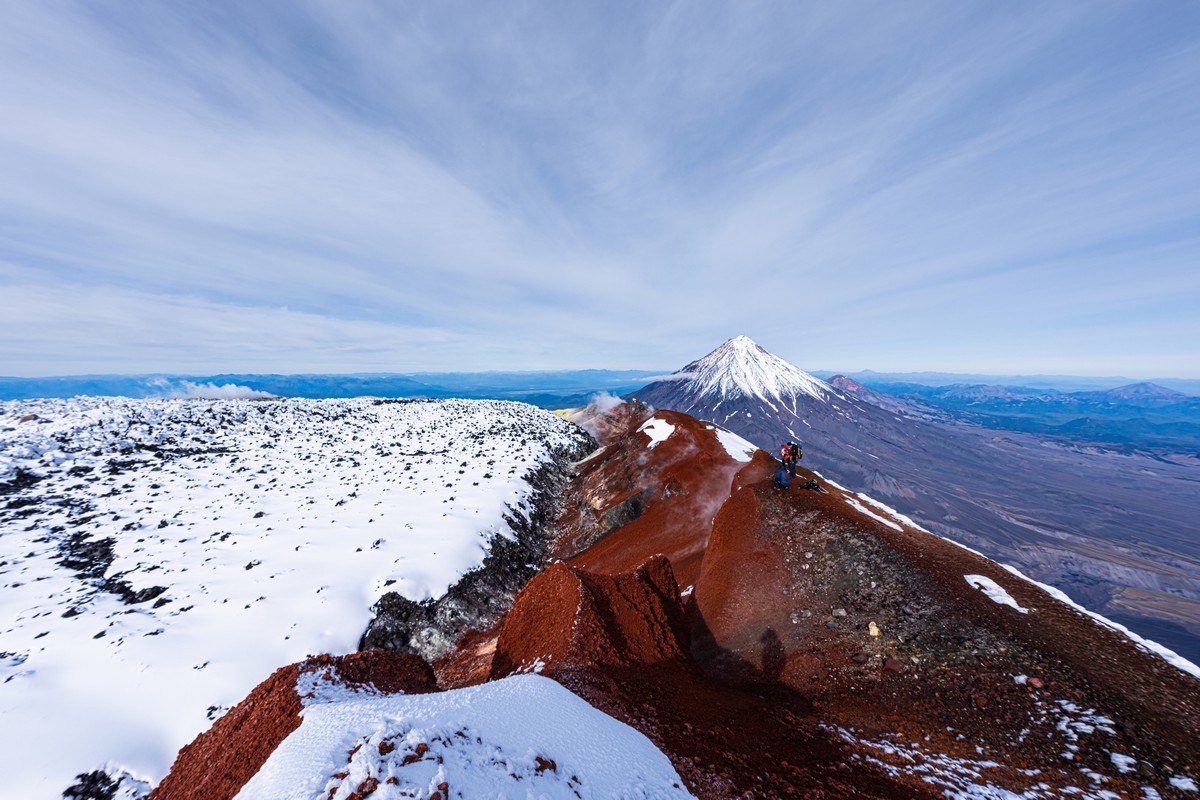 At the summit of Avachinsky, with the neighboring Koryaksky volcano behind it: