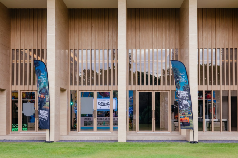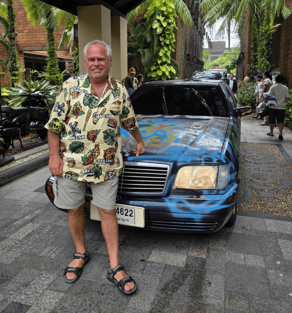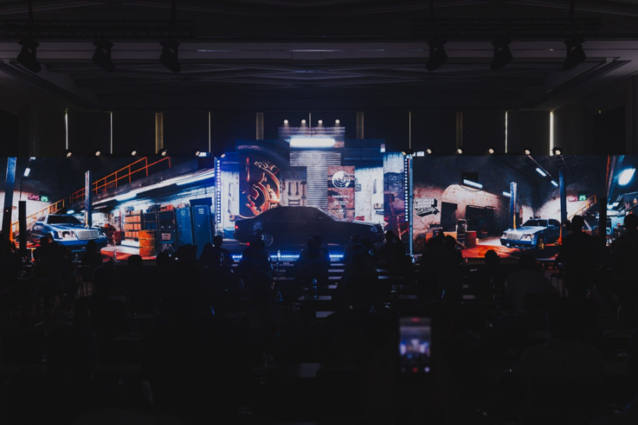 And just when you might think it couldn’t get more fun, an old 1998 S-class Mercedes, bought right here in Thailand, rolled onto the stage – driven by British pro racing driver Jann Mardenborough! ->