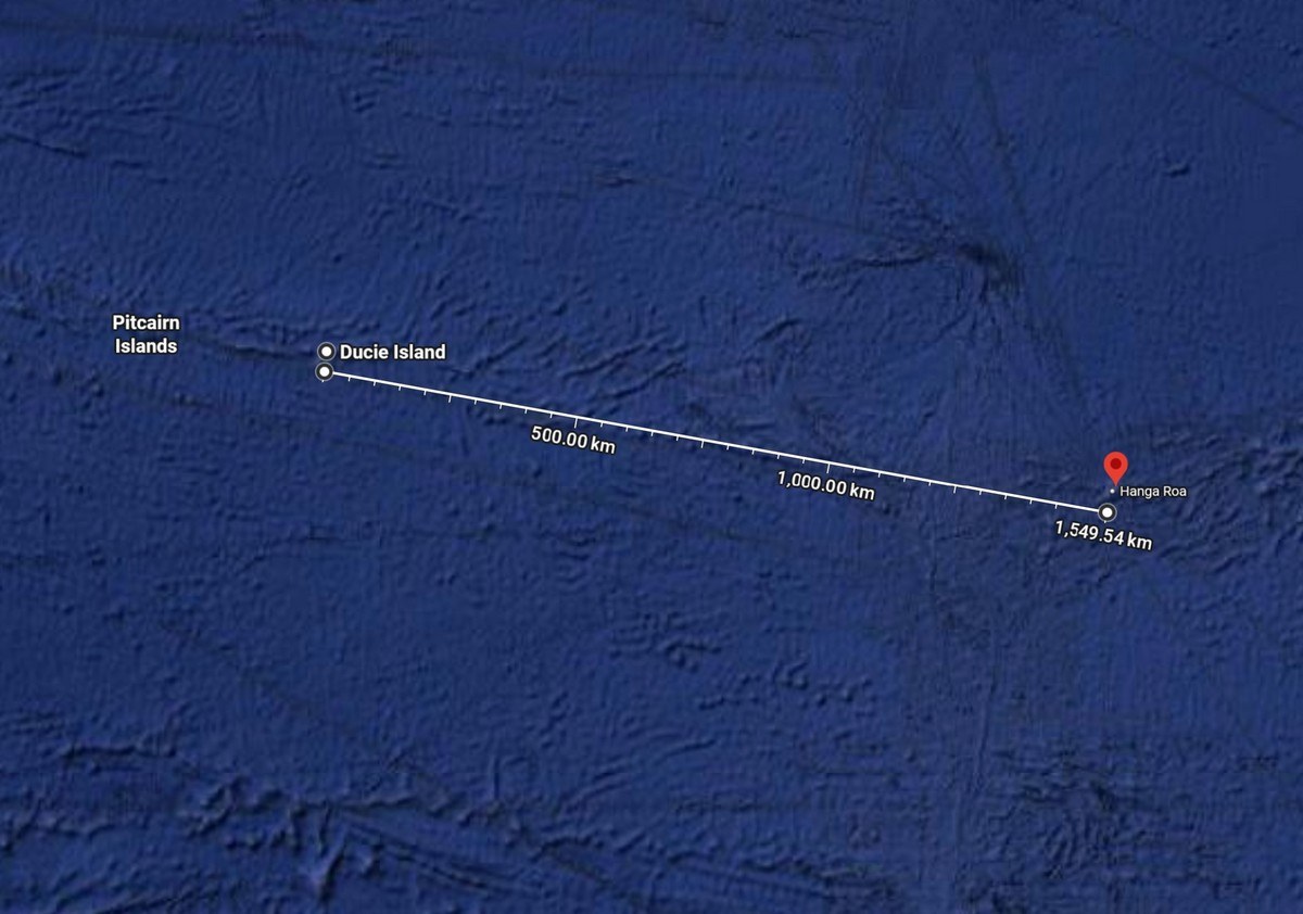 By around 1200AD (the date most scholars agree on), Polynesians settled on Rapa Nui. And they must have reached other equally remote islands along the way – for example, what are today known as the Pitcairn Islands and also Ducie Island; but even from those, it’s still more than 1500 kilometers in a straight line to Rapa Nui! ->