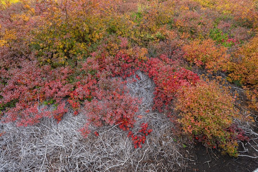 I’ve said it before, but it bears repeating: the vivid reds you see in September come from several plants: blueberry bushes, Swedish cornelian cherry (both the berries and leaves), and alpine bearberry (Arctous alpina) – the one with the large black berries and red leaves:
