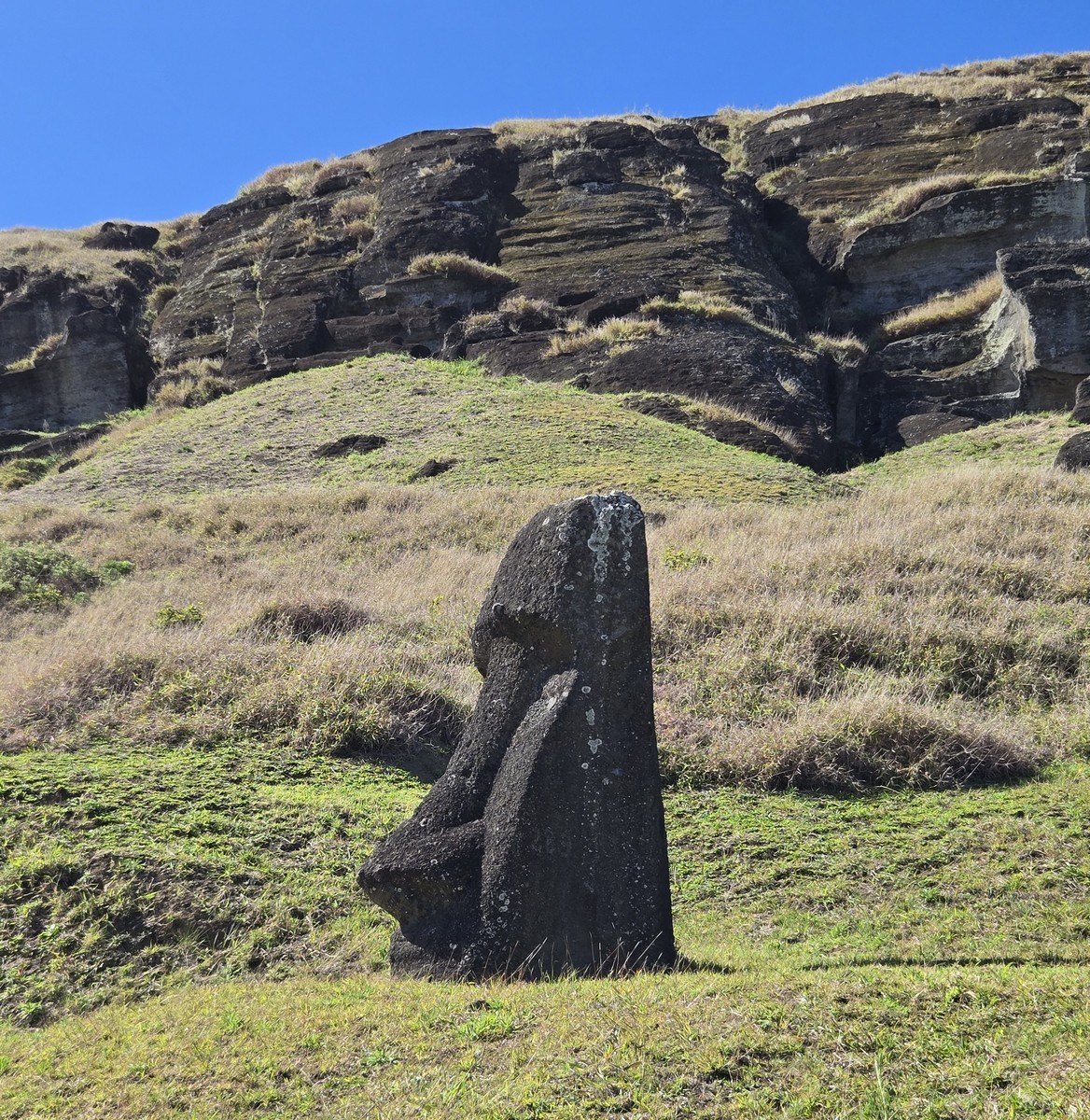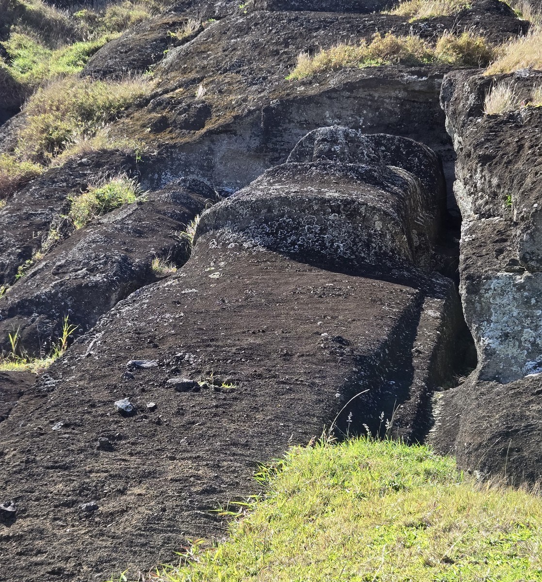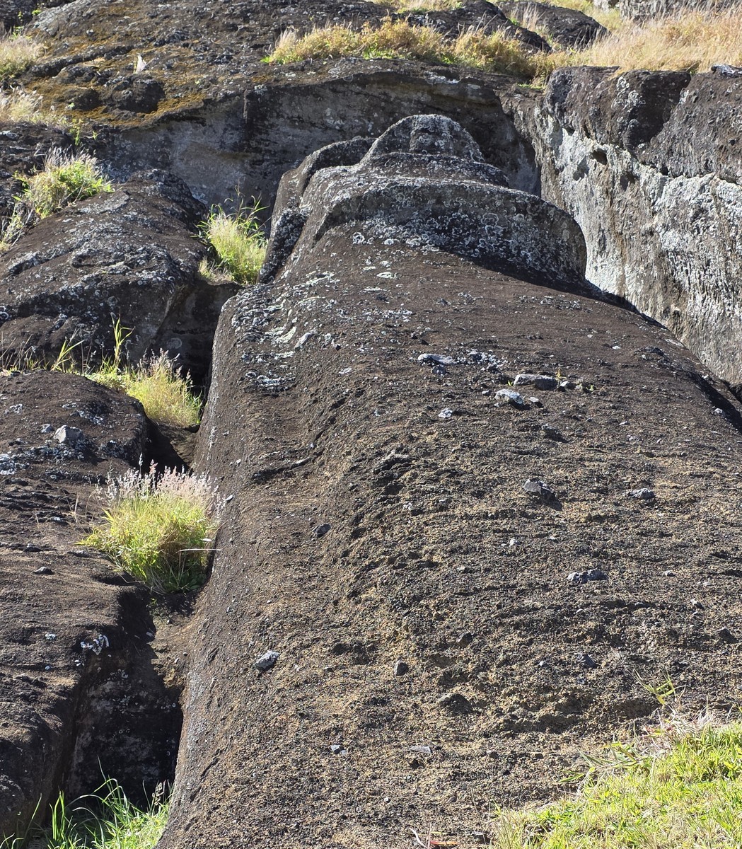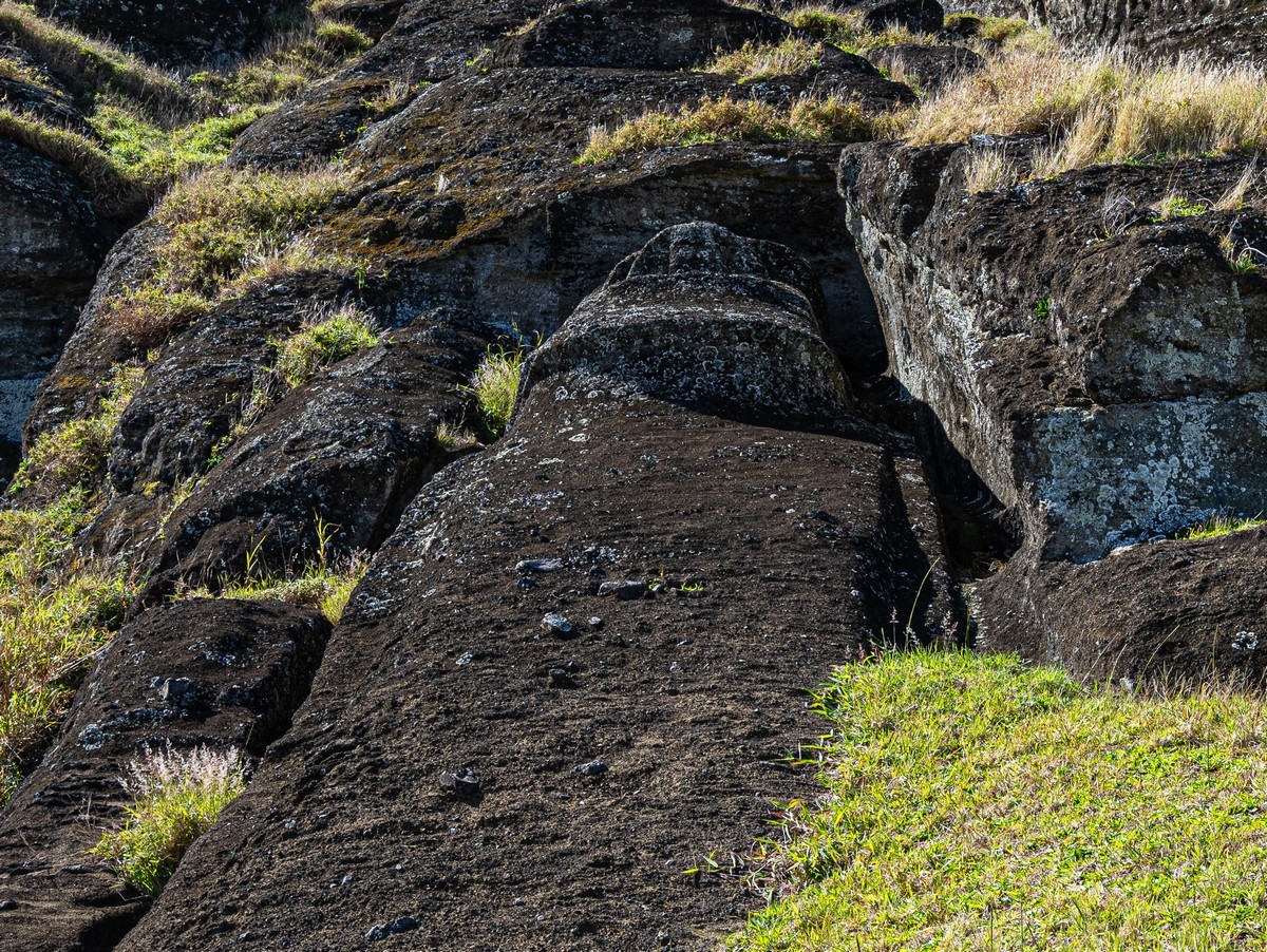 The ancient quarries are frozen in time – no more stonecutters hammering away, no more workers bustling about. The brightly dressed overseers who once supervised everything have vanished into the mists of history. Or maybe there weren’t dressed in bright clothes. Who knows? Anyway, the statues that remain stand and gaze wherever they were installed, and the unfinished ones still lie on the slopes of Rano Raraku volcano. Weathered and eroded, noses pointing upward, sometimes hard to spot on the slopes – like these. Can you see them? ->