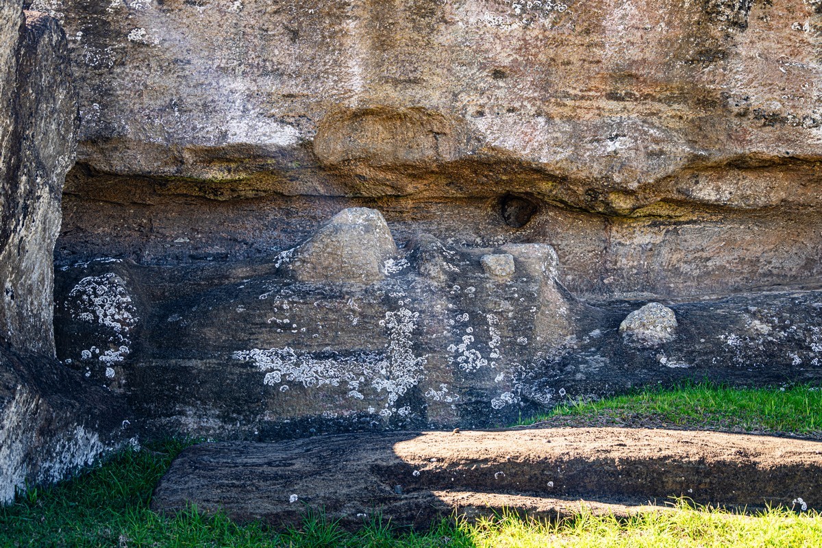 To reiterate: according to published research, the first people arrived on the island around 1200AD. The earliest – the smallest and least unimpressive – stone statues date from around 1250. Then, in the 1500s and 1600s, the local civilization reached its peak, and moai-quarrying-and-installing flourished, but then everything (moai construction, ecology, population – the lot) eventually collapsed/disappeared – for good. The statues have stood here ever since. Only the heads and shoulders are visible – the rest is buried underground: