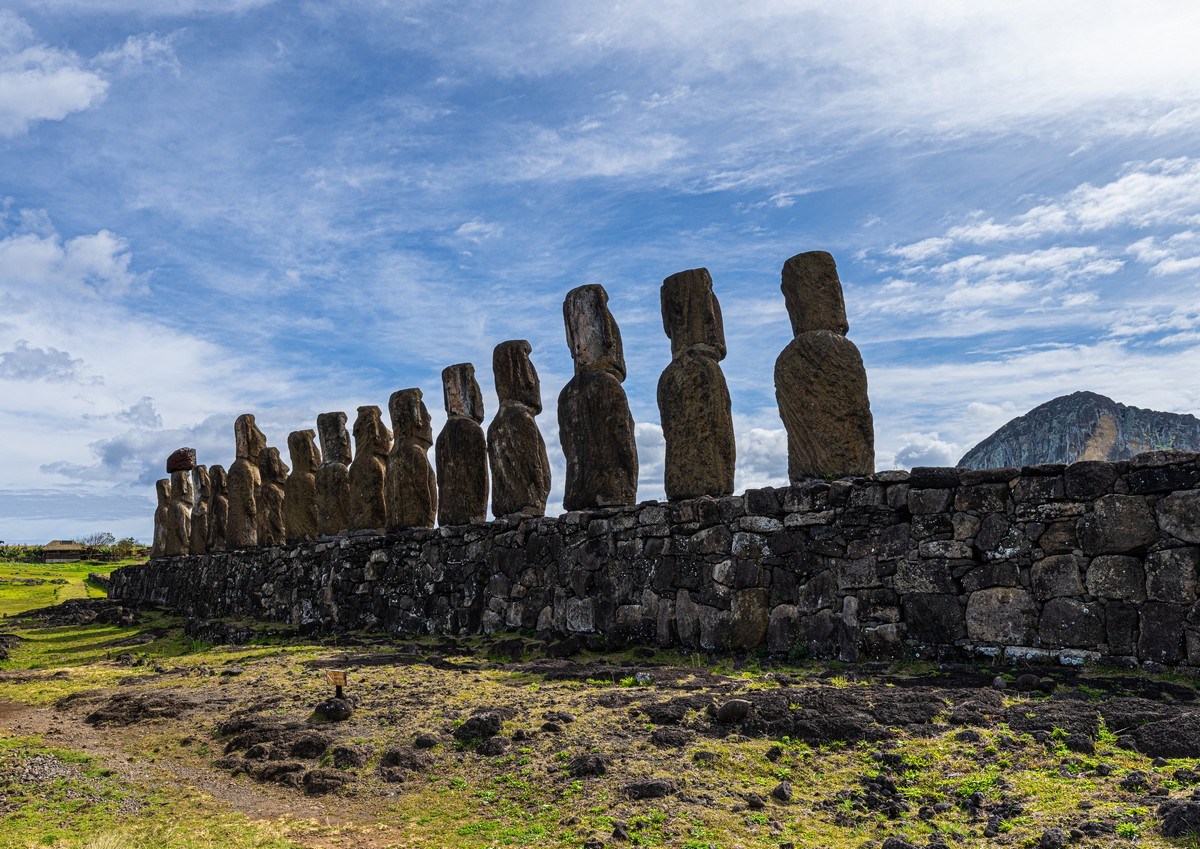 The largest ritual-platform-installation (“ahu“) of moai on the island is Ahu Tongariki. Today it features 15 statues; how many there were originally is unknown, since they were all knocked down during local tribal wars, and then, in modern times, a tsunami (after a major earthquake on the mainland) swept away the whole structure. In short, the fate of these moai was far from simple…