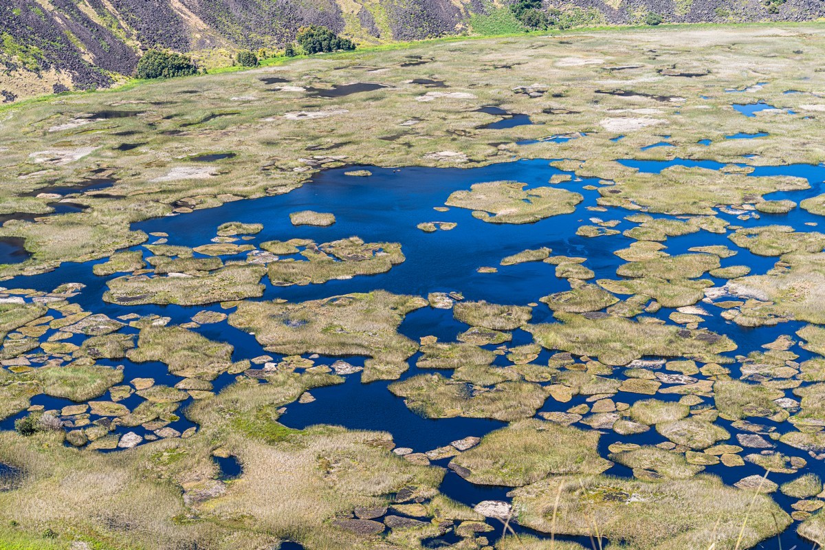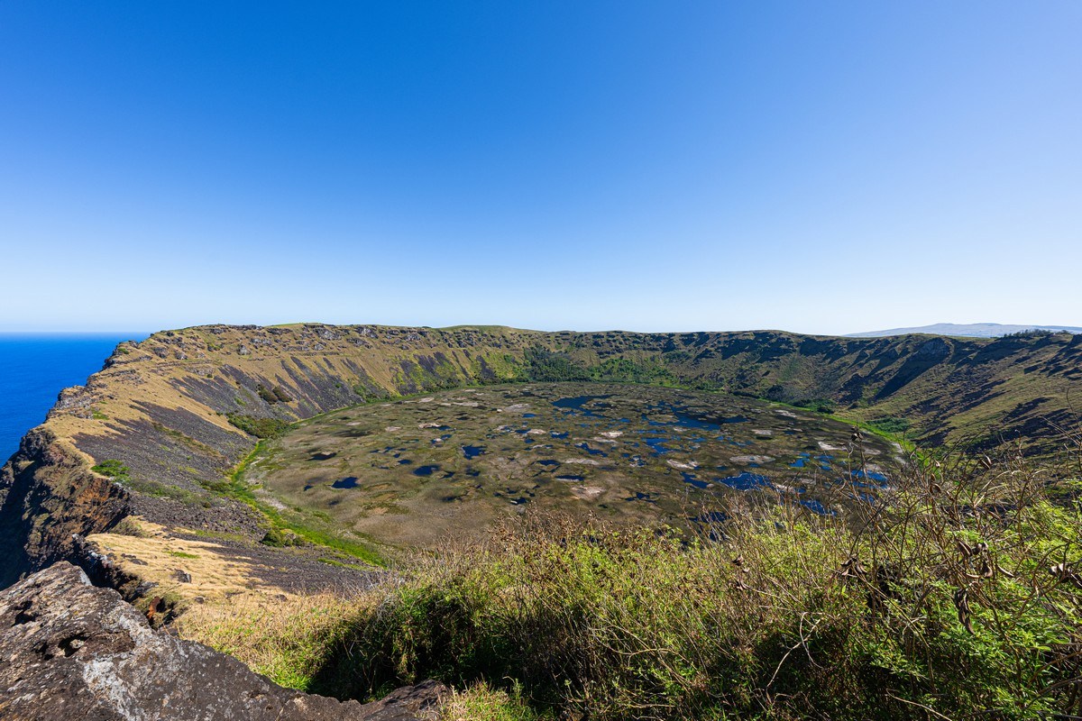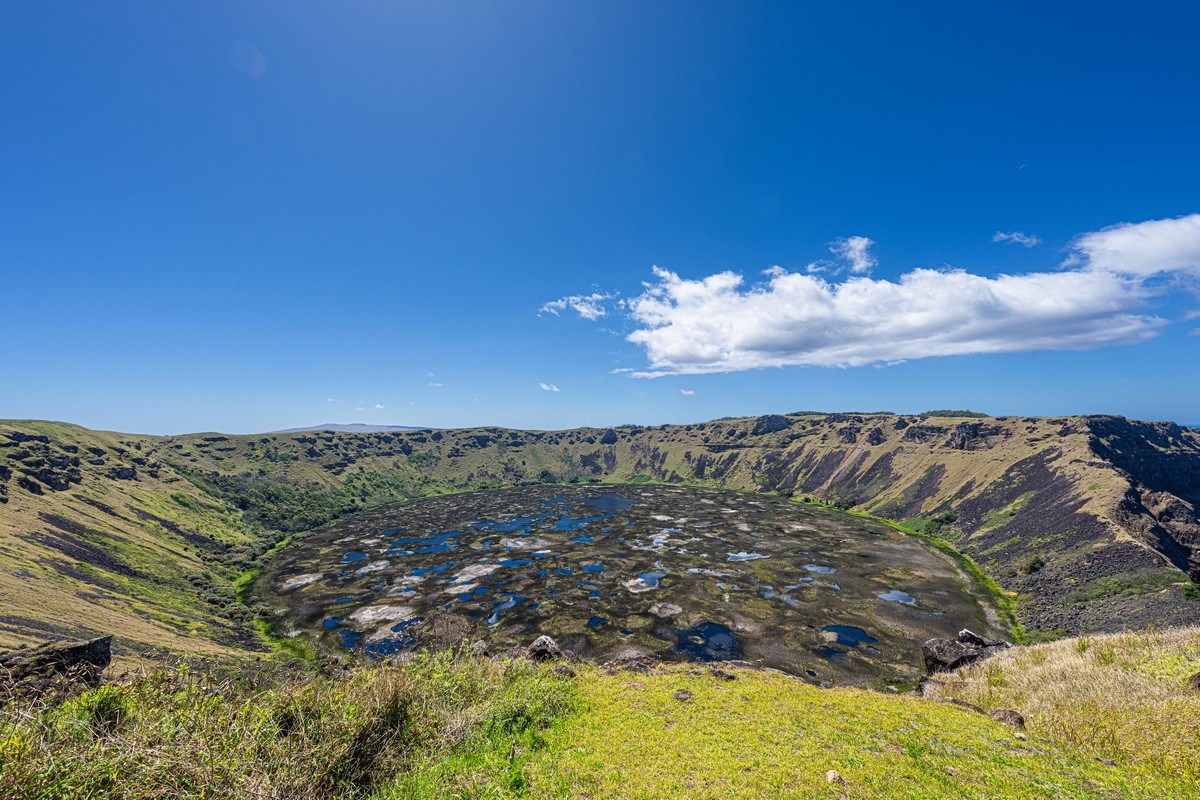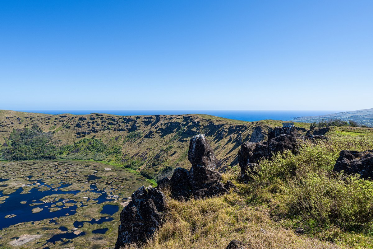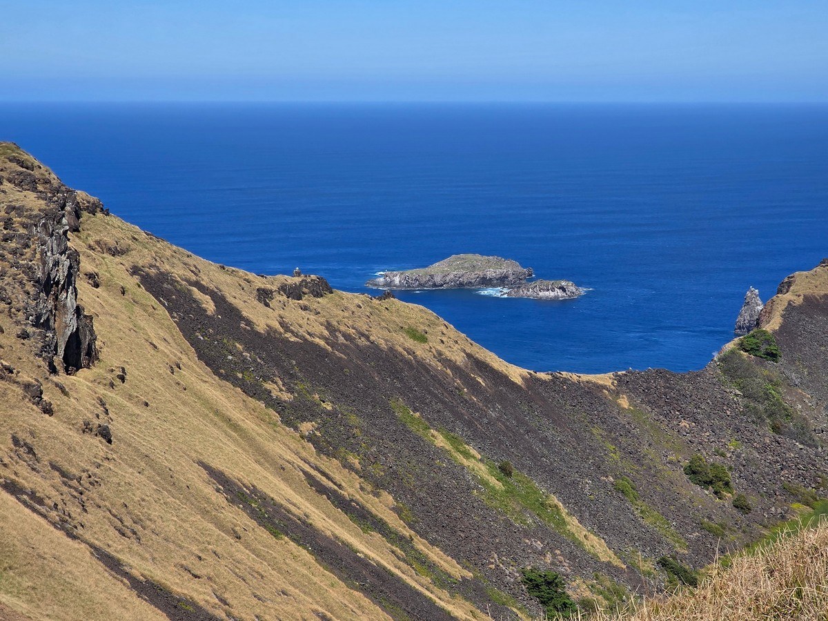 Another, more interesting walk is to the crater of the Rano Kau volcano (in the next pic) at the southwestern end of the island, and to the ceremonial village of Orongo, where, hundreds of years ago, competitions dedicated to the birdman cult were held. Both these sites were our destinations for the afternoon, and there were plenty of other interesting sights along the way…