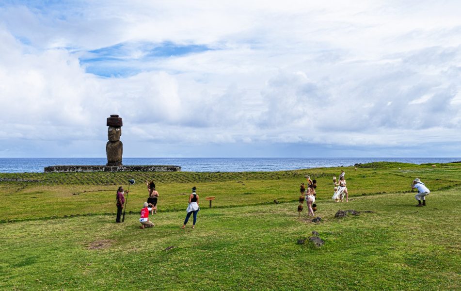 Interestingly (according to the same guide, though I’m not sure I believe it), there’s no pumice on this volcanic island at all! They collect pumice that washes up on shore. Is that true? Pumice could float thousands of kilometers on ocean currents? I doubt it. But busy photo sessions by the ancient statues – those definitely happen! ->