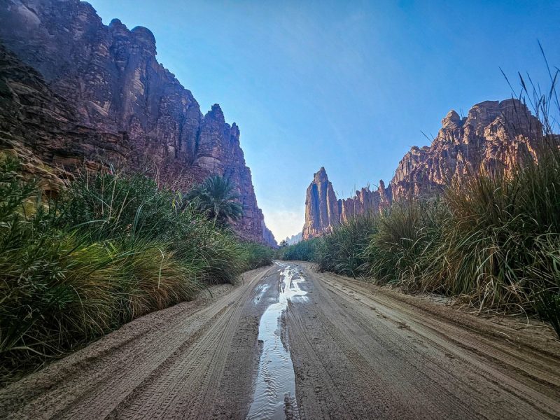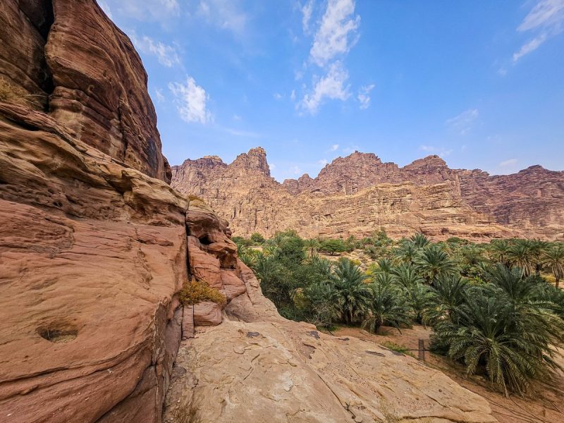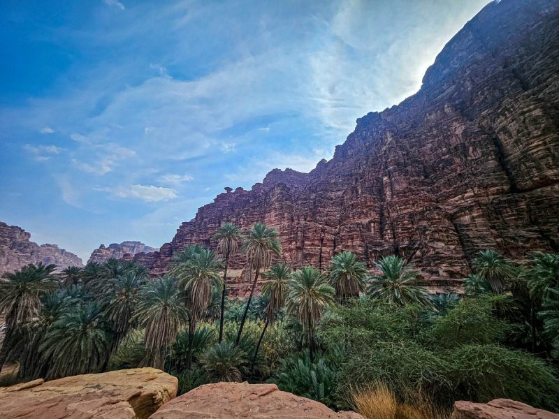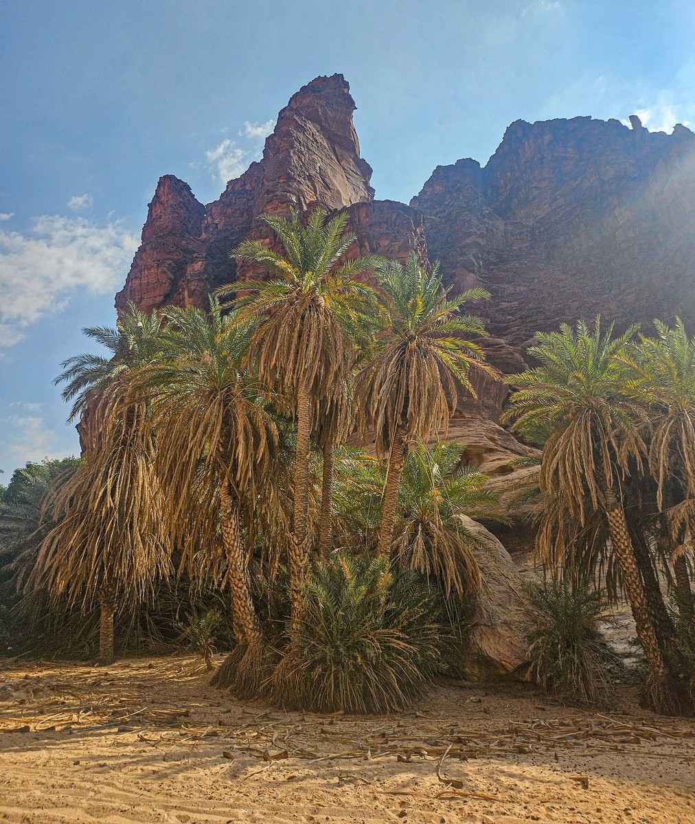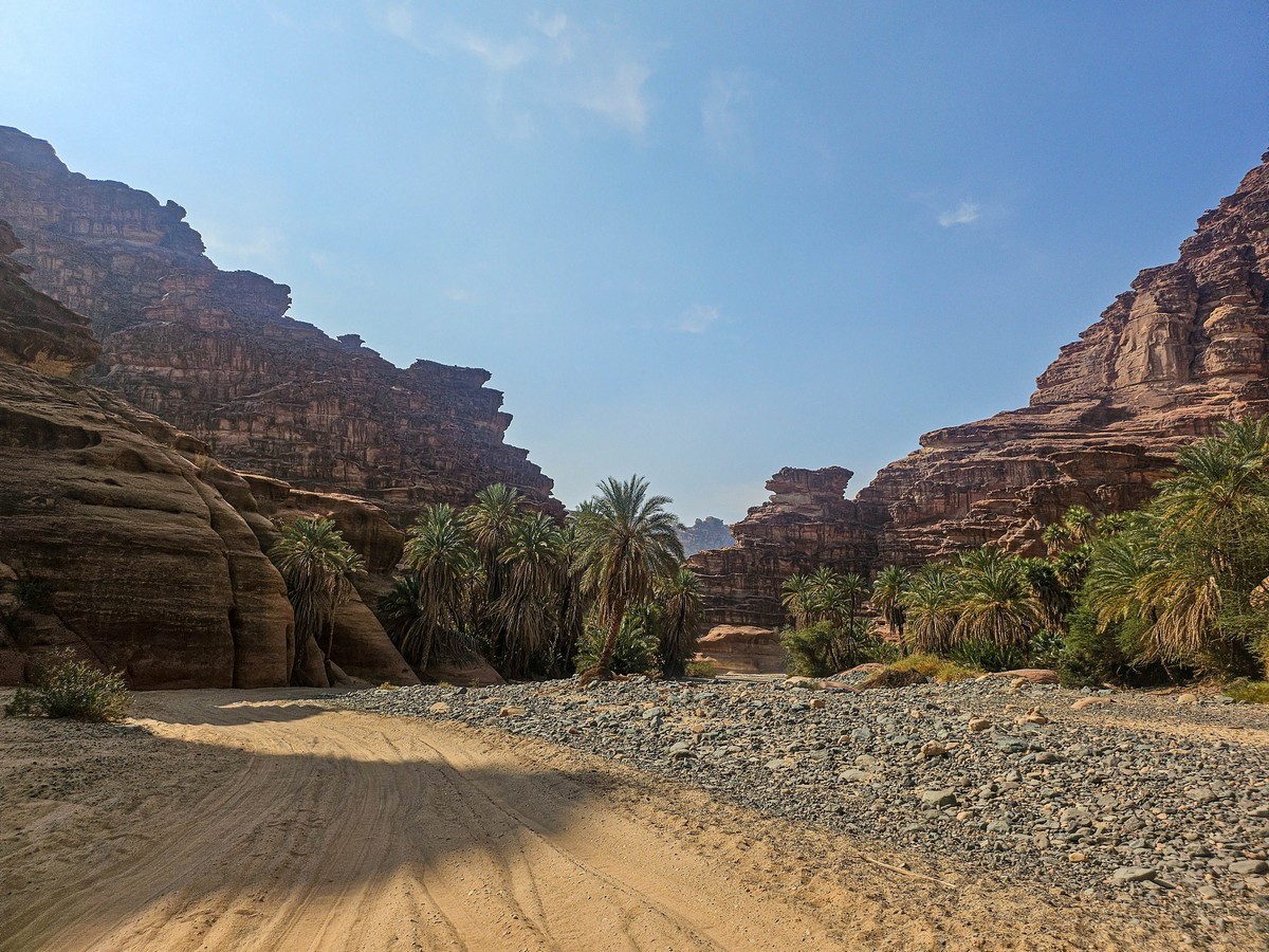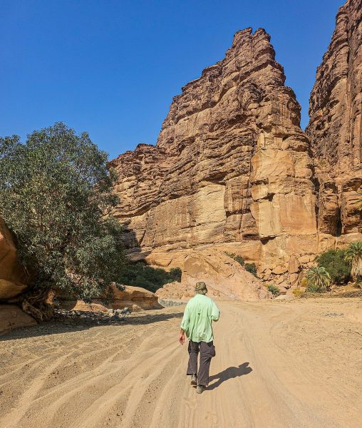 There was also time for tourism: I’d long planned to walk through the Wadi al Disah gorge – an amazing spot with mountain landscapes, cliffs, and palm trees. Stunning views! ->