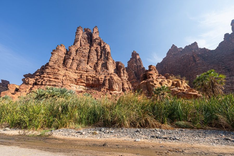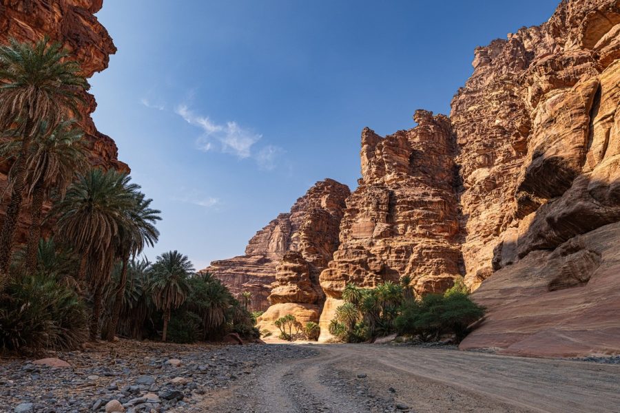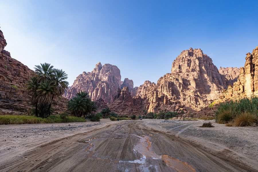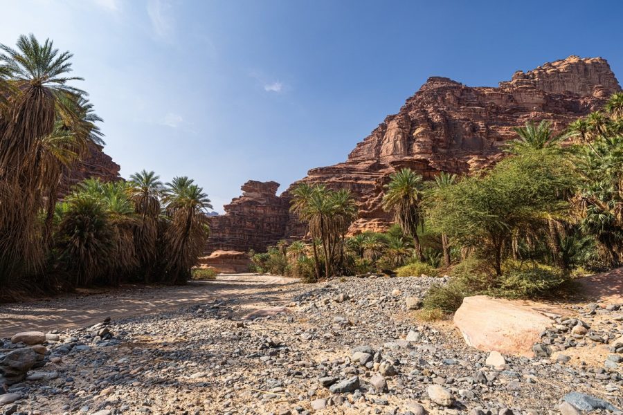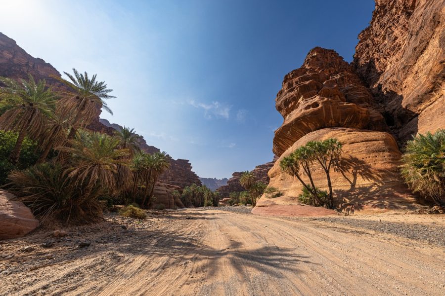 An oasis in the sandy Saudi desert.
