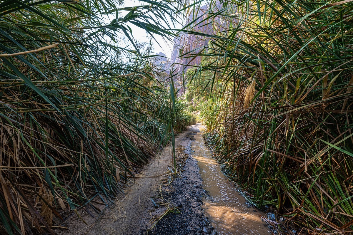 Very simple. Roughly in the middle of the hiking route, water starts seeping up through the sand – and from this point onward the road, which hugs the banks of a stream, is very damp.