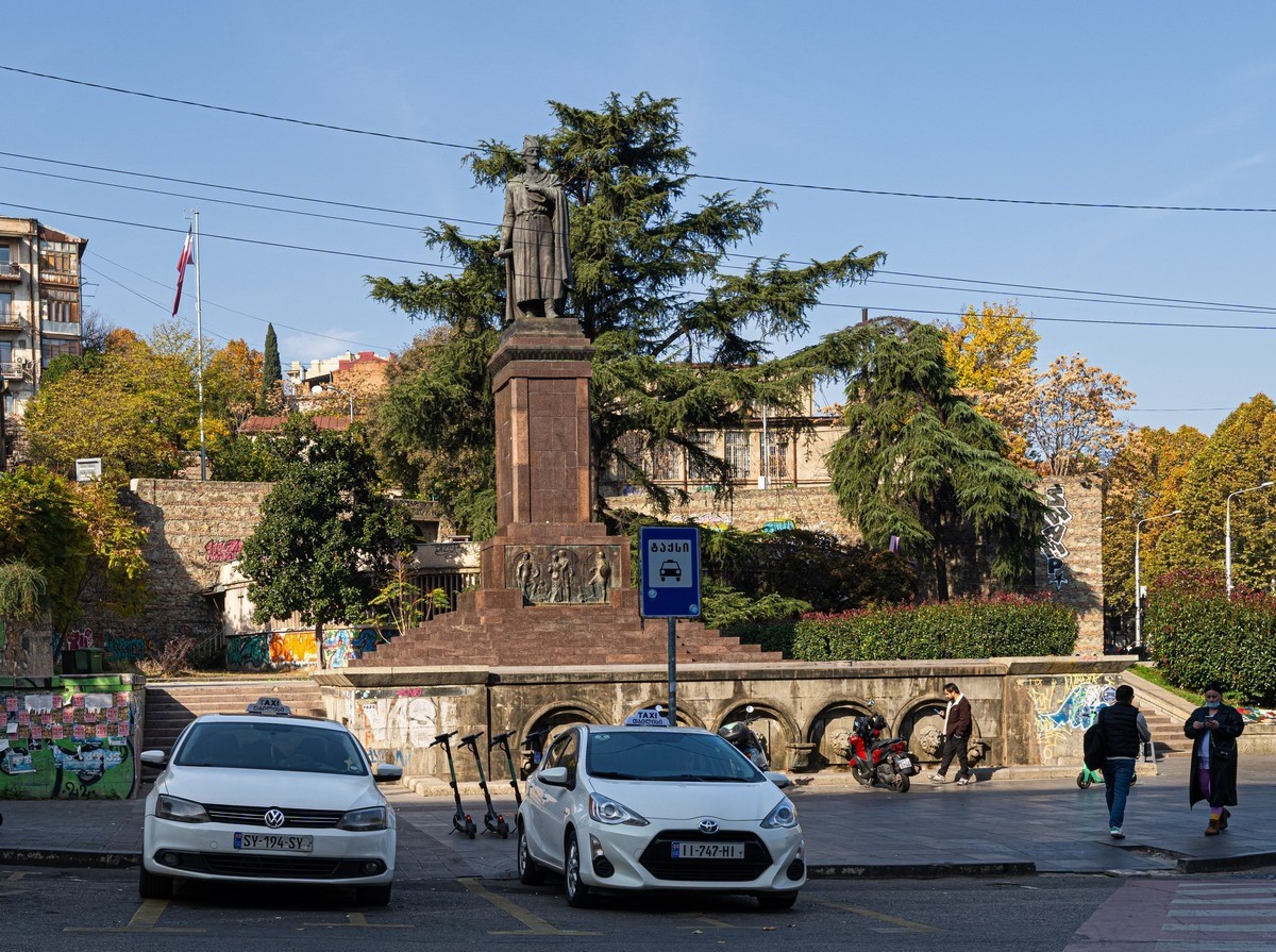 But why are wires stretched right in front of one of the main symbols of Georgia? How come there’s graffiti on the pedestal? And how come they stuck a taxi rank right in front of it? WHY?!