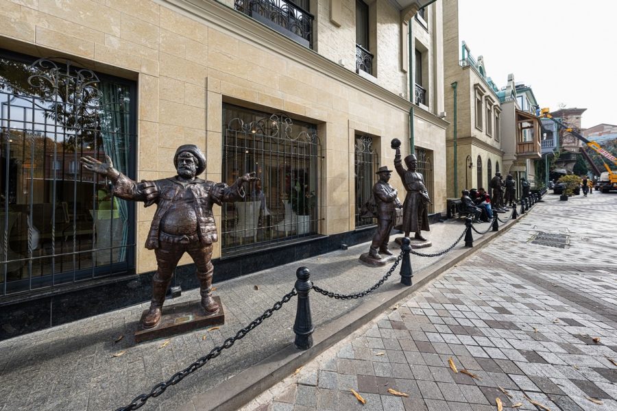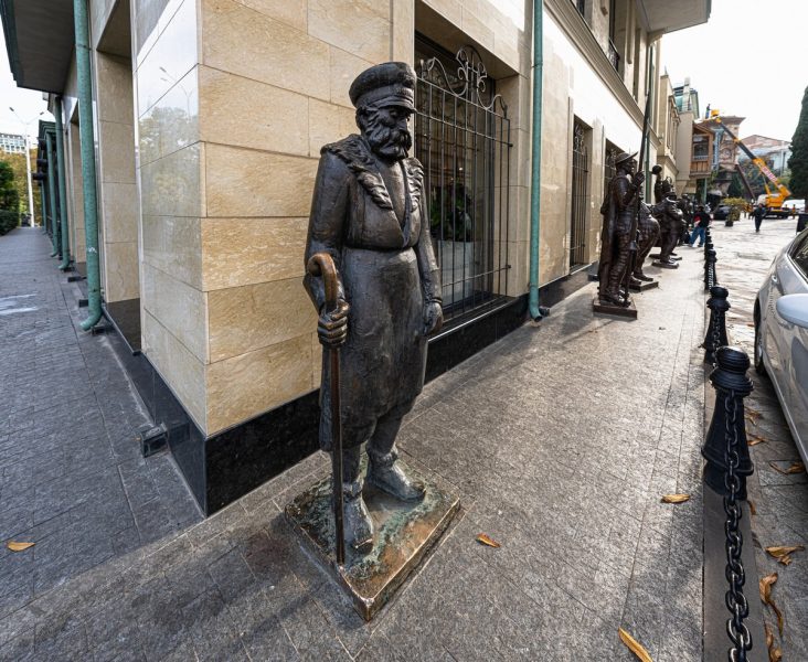 We move on according to the plan of today’s tour. We wound through the city’s lanes, went down to the Kura River via Pushkin street, and then found ourselves at an installation called “The Berikaoba Sculpture Group”: