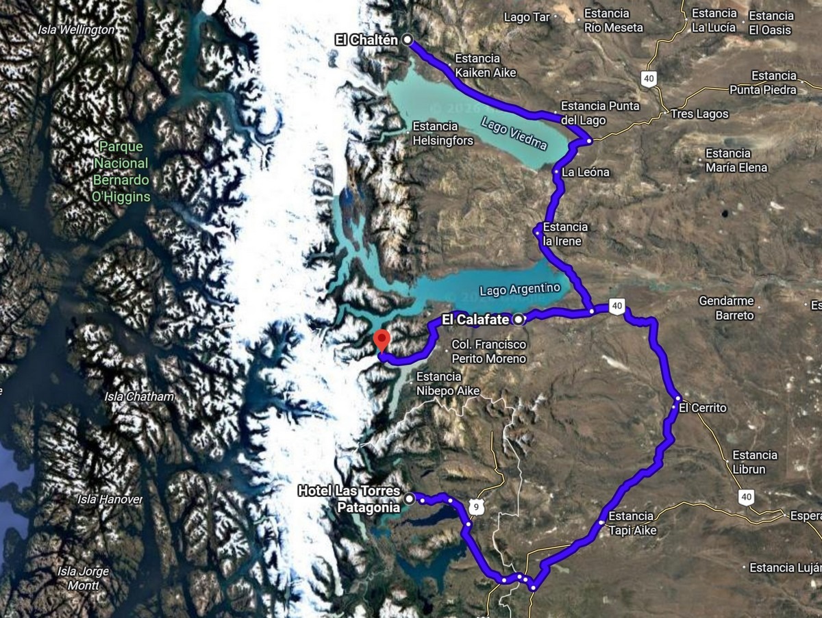 Segment 2: Chilean Patagonia → Argentine Patagonia. One day getting from one to the other, one day for a glacier, three days trekking and exploring, one day for the Perito Moreno Glacier = six days.